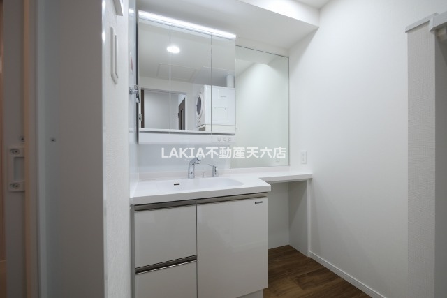 「ノルデンタワー南森町アドバンス」の洗面台は、デザイン性と実用性を兼ね備えた使いやすい空間です。ゆとりあるカウンターは身支度やスキンケアを快適に行え、忙しい朝もスムーズ。収納力の高いミラーキャビネットと下部収納を備え、化粧品や洗面用品をすっきり整理できます。清潔感のある素材と落ち着いたカラーリングが、空間全体に上質な印象をプラス。毎日使う場所だからこそ、快適さを実感できる洗面スペースです。